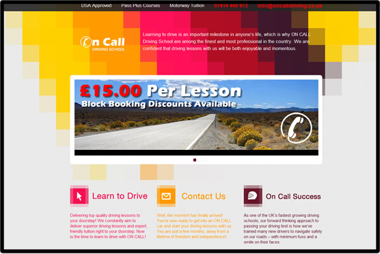 Simple website to promote the On Call Driving School. The client wanted to expand their customer base and increase new visitors. To achieve this we reinforced their brand online, helping visitors to the website associate the site with the driving school and vice versa.
